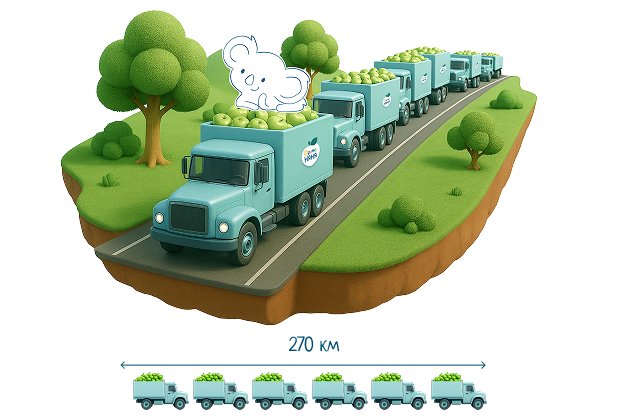 яблок в годДля производства продукции «ФрутоНяня» в год используется более 450 млн кг яблок — это примерно 23 000 грузовиков по 20 тонн, выстроенные в колонну длиной 270 км . Это почти как расстояние от столицы до Ярославля.