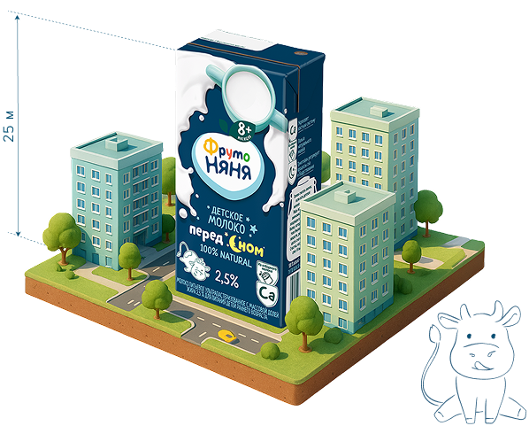 в месяцЗа месяц для производства продукции «ФрутоНяня» используется около 3,5 млн литров молока. Это объем сопоставим с огромной упаковкой молока высотой более 25 м – как 8-этажный дом!