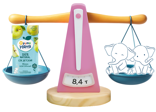 сока в часКаждый час завод «ФрутоНяня» производит 40 000 упаковок сока. Общая масса этой продукции — 8,4 тонны, что сравнимо с весом двух взрослых слонов.